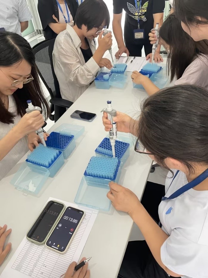 本次竞赛包含转移枪头、溶液定容两项活动。评判标准为质量、规范、风格、速度的比拼。转移枪头无误、速度快且时间短,溶液定容准确无误且用时短为获胜者。